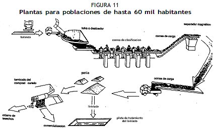 Una instalación muy simple y pequeña se halla esquematizada en la Figura 11. En este caso, se descargan los residuos sólidos directamente en un foso con piso móvil, que alimenta la correa de clasificación, de donde se retiran los elementos reciclables. La polea de descarga debe ser magnética, para que retire las pilas, baterías y otros materiales ferrosos.