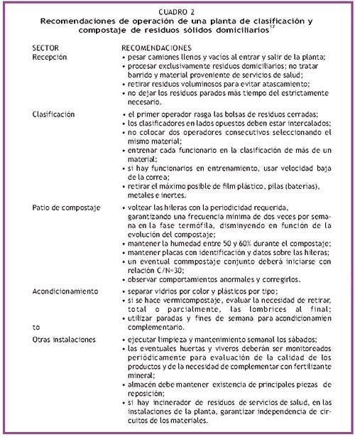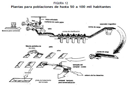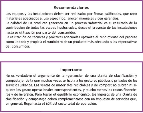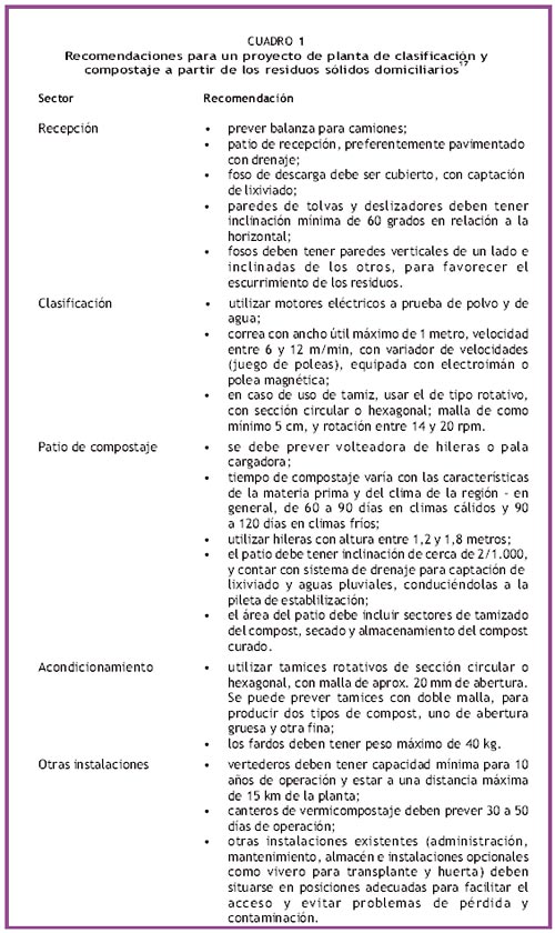 A continuación se presentan las alternativas que se consideran más recomendables para la realización de la clasificación y el compostaje a nivel industrial, en función de la población atendida. Para plantas de pequeño porte (las que tratan los residuos sólidos domiciliarios de hasta 150 mil personas), se debe adoptar el método del compostaje natural, más lento y con menores exigencias de inversión. Para instalaciones que tratan los residuos sólidos de más de 300 mil habitantes, se recomienda la utilización del proceso acelerado, más rápido, y que requiere menor espacio. Plantas para atender poblaciones de entre 150 y 300 mil habitantes deberán ser objeto de evaluación técnico-económica, para escoger la alternativa más adecuada.