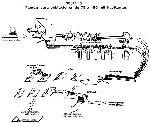 En la Figura 12 se presentan las instalaciones para una planta un poco mayor, que atiende a una población de 50 a 100 mil habitantes. En este caso, la recepción consta de un foso, que sirve como un pulmón, para alimentar, mediante un pulpo con brazo articulado, una tolva con piso móvil, la cual a su vez alimenta la correa de clasificación.