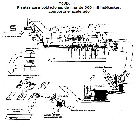 Son instalaciones de compostaje acelerado, donde el procedimiento difiere del compostaje natural por la presencia de un digestor o reactor, también denominado bioestabilizador. En esta clase de plantas se encuentran equipos con características y metodologías especiales, que no se encuentran en las de compostaje natural. Entre tales equipos se pueden mencionar: más de una línea de tratamiento de residuos sólidos; grandes fosos y tolvas, atendidas por un puente rodante; separadores magnéticos, neumáticos y balísticos, para la remoción mecánica de reciclables o de inertes; filtros biológicos para gases y partículas; tratamiento de aguas residuales y lixiviado; poderosas máquinas especiales para voltear el compost en el patio (Figura 14).