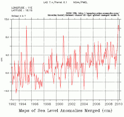 ![]() La imagen de abajo muestra las series de corrientes y las anomalías del nivel del mar (cm) desde marzo 1002 hasta marzo 2010. |