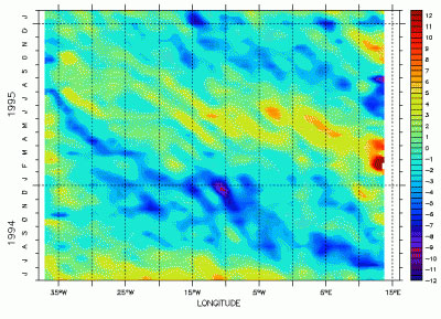 La imagen de arriba muestra el gráfico tiempo-longitud de anomalías del nivel de mar (en cm) ente 36º” y 15ºE, latitud 10ºS, entre junio de 1994 y enero de 1996. En cuanto sepamos algo más de este interesante fenómeno natural vamos a actualizar este artículo. SAND-RIO (Artículo de Paolo LUI de: http://www.wpsmeteo.com/index.php)