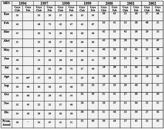 2.9. Con relación al material particulado respirable PM10, el análisis de la información otorgada por las estaciones de monitoreo de Coya Poblacional y Coya Club de Campo, señala que durante toda la vigencia del plan no se verificaron valores superiores a la norma diaria de 150 ugr/m3N establecida en el D.S. Nº 059 MINSEGPRES. Así también de la información analizada se puede señalar que en ambas estaciones durante el período 2000 -2002 el valor promedio anual no superó la concentración anual de 50 ugr/m3N, norma de calidad primaria para material particulado (D.S. Nº 45 MINSEGPRES). La tabla siguiente muestra un resumen de las concentraciones promedios mensuales período 1996-2002.