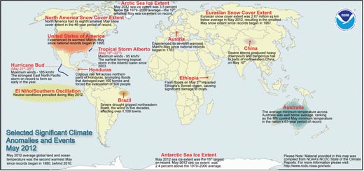- La temperatura de superficie de tierra, promediada globalmente para Mayo 012 fue el Mayo más caluroso en registro, con 1,21ºC (2,18º) por encima del promedio.