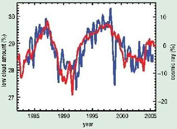 La cantidad de cobertura de nubes bajas varía en proporción a la cantidad de RC que llegan a la baja atmósfera como se muestra en el siguiente diagrama.