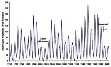 Sabemos que mientas más largo es un ciclo solar, menor es la cantidad de manchas de sol en el próximo ciclo. Ahora ha pasado casi un siglo desde que se registraron valores tan bajos en manchas de sol (Ver al año 1900 en el diagrama de la Figura 2). Apenas unos pocos días más sin manchas en el sol nos dará un retardo similar al del Mínimo Dalton ocurrido entre 1795 y 1823. Este fue un período muy frío que influenció profundamente la obra de Charles Dickens (nacido en 1812) a causa de la frecuente y prolongada nieve en el Londres de su niñez y el fracaso de las cosechas que crearon la condiciones sociales sobre las que escri-bió de manera tan elocuente. No hará falta un retraso más largo para que las condiciones sean iguales a las del Mínimo Maunder cuando no hubo manchas en el sol desde 1645 hasta 1715, que coincidió con la Peque-ña Edad de Hielo.