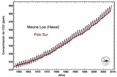 Concentración de CO2 (en ppm) en el Mauna Loa (Hawai) y en el Polo Sur (1958-2009)