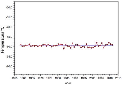 Como se ve en la figura de arriba el incremento del CO2 en el Polo Sur* (en rojo) ha sido semejante al incremento registrado en el Mauna Loa (Hawai), que es la estación que se toma como referencia mundial. La única diferencia es que en el Polo Sur, muy alejado de zonas con vegetación, no se notan las variaciones estacionales y la curva de incremento no presenta los dientes de sierra de la del Mauna Loa. Y como se ve en la figura de abajo, este incremento de CO2 no se ha visto acompañado de una subida térmica de la temperatura media anual, que sigue siendo de unos -50 ºC.
