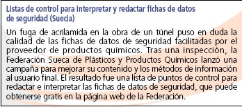 Las fichas de datos de seguridad son la fuente de información más común. Los trabajadores o sus representantes deben tener acceso a todas las fichas de este tipo que faciliten los proveedores. Las fichas de datos de seguridad contienen información sobre propiedades de las sustancias, naturaleza de los riesgos, almacenamiento, manipulación, equipos protectores, etc., y se utilizan para crear bases de datos, fichas de instrucciones para los trabajadores y manuales de seguridad. Estas fichas son tan exhaustivas que a veces rebasan los conocimientos del trabajador medio y están dirigidas fundamentalmente al personal encargado de la seguridad y la salud en el trabajo y al empresario. A menudo no es posible valorar de antemano los riesgos que se derivan del uso de un producto, inclusive todos los detalles precisos que requiere una sustancia concreta en un proceso definido. Dado que a veces las fichas contienen información incompleta o incluso incorrecta, es recomendable mantener una actitud crítica en su aplicación y en la transmisión de la información que contienen al lugar de trabajo.