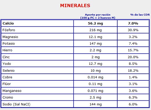 El huevo contiene gran cantidad de vitaminas y minerales, protegiendo del déficit de las mismas en una dieta de pérdida de peso, ya que contiene vitaminas del grupo B (B1, B2, B6 y B12), E y D; y minerales como el hierro, selenio, yodo, folato y zinc. Además es un alimento natural y “envasado en origen”, una de las creaciones más completas de la naturaleza que aporta la mejor nutrición al menor costo.