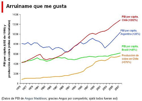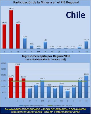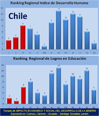 En el gráfico podemos ver la relación directa entre el incremento del PBI y la producción de cobre. En los cuadros, donde se comparan los parámetros económicos y sociales de las regiones chilenas (tomados de IMPACTO ECONOMICO Y SOCIAL DEL DESARROLLO DE LA MINE-RIA, Exposición en Cuenca y Zamora – Ecuador – Santiago González Larraín), vemos que las de mayor actividad minera, son las que tienen los mejores índices de desarrollo humano y de logros en educación.