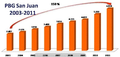 De acuerdo a las estimaciones para el 2011, el PBG de San Juan creció un 15%, mientras que las exportaciones aumen-taron un 19%, y la tasa de desocupación bajo un 25%, res-pecto al 2010.