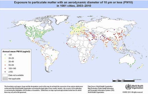 La Organización Mundial de la Salud acaba de publicar un estudio referido a 1.081 ciudades repartidas por todo el globo sobre la limpieza del aire urbano. El parámetro escogido es el de las partículas en suspensión que tienen un diámetro de 10 micrómetros o menos (PM10), las que suelen formar la “boina” de contaminación urbana.