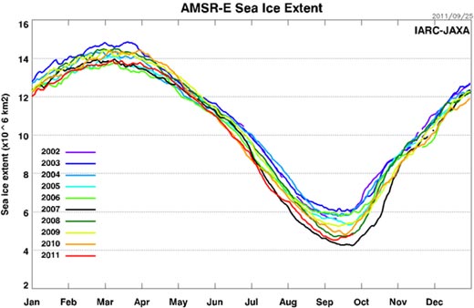 El 9 de Septiembre se llegó al mínimo anual de su extensión (4.526.875 km2). Desde ese día hace cada vez más frío, hay cada vez más hielo, está más oscuro todo.