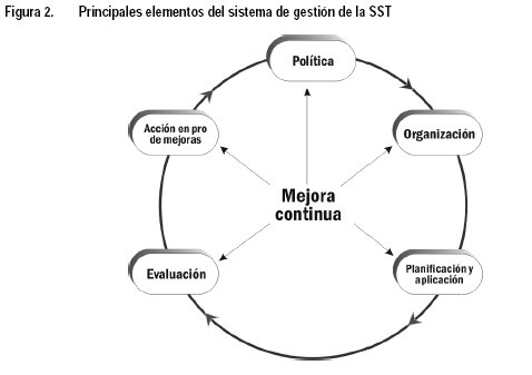 La seguridad y la salud en el trabajo incluyendo el cumplimiento de los requerimientos de la SST conforme a las leyes y reglamentaciones nacionales son la responsabilidad y el deber del empleador. El empleador debería mostrar un liderazgo y compromiso firme con respecto a las actividades de SST en la organización, y debería adoptar las disposiciones necesarias para crear un sistema de gestión de la SST, que incluya los principales elementos de política, organización, planificación y aplicación, evaluación y acción en pro de mejoras, tal como se muestra en la figura 2: