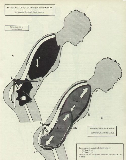 Por otra parte él conjunto del tronco interviene para suavizar la presión sobre el disco lumbosacro y sobre el ráquis lumbar inferior. En efecto, es notable que en los esfuerzos de levantamiento se realice instintivamente una “presión abdominal”. ¿En que consiste esta presión abdominal, llamada también maniobra de VALSALVA? Sencillamente en que se asocia el cierre de la glotis y de todos los orificios abdominales (pujar) transformando de este modo a la cavidad abdominotoráxica en una cavidad cerrada, a la contracción sostenida de los músculos espiratorios, en particular de loa músculos abdominales. Con ello, la presión aumenta en la cavidad abdominotoráxica y transforma ésta en una viga rígida situada por delante del raquis mismo que trasmite los esfuerzos a la cintura pelviana y al periné. La intervención de esta estructura hinchable reduce de manera notable la compresión longitudinal a nivel de los discos: en el disco D12-L1 decrece en un 50% y el disco lumbosacro en un 30%. Por la misma razón, el grado de tensión de los músculos espinales baja en un 55%.