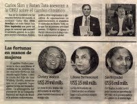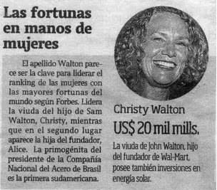 En extraordinaria coincidencia, en la misma hoja, el matutino publica una nota dedicada a las mujeres más ricas del mundo, y la primera de ellas resulta ser la viuda del hijo de Sam Walton, quien fuera el dueño y fundador de Wal-Mart.
