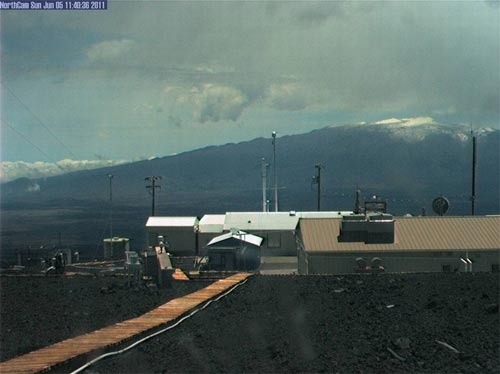 Esta imagen muestra la cumbre nevada del Mauna Kea el 5 de junio 2011 visible en la parte superior derecha del Observatorio de CO2 del Mauna Loa.