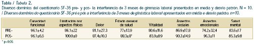 La Tabla 2 presenta los valores referentes a las 8 dimensiones evaluadas por el SF-36. La capacidad funcional fue la única dimensión cuyo valor no sufrió ninguna alteración. En los valores referentes a la limitación por aspectos físicos, dolor, estado general de salud, vitalidad, aspectos sociales, aspectos emocionales y salud mental se observó un aumento en estos valores después de la aplicación de los tres meses del protocolo experimental, no comprobado por el análisis estadístico. El parámetro Estado General de Salud presentó aumento después del protocolo de gimnasia laboral.