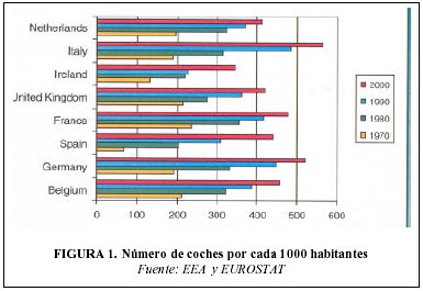 La Figura 1 nos muestra como en Europa el incremento de los coches durante los últimos 30 – 40 años ha sido constante, en cambio en Italia se pasó de 187 coches por 1000 habitantes en 1970 a 563 en 2000.