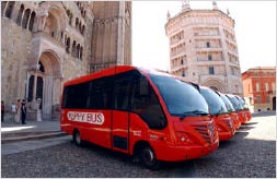 El “happy omnibus” es un proyecto creado por el TEP en Parma (Italia): es un servicio escolar para viajar de la casa a la escuela con seguridad y sin problemas de accidentes y contaminación. Según primeras indagaciones al principio en la ciudad no había ninguna movilidad privada casa/ escuela.