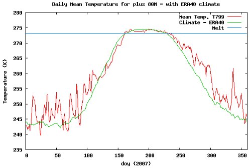 FAEC: Mi humilde contribución al asunto comenzó el 28 de Diciembre del año pasado cuando hice mi chequeo rutinario de las temperaturas del Ártico y la extensión de sus hielos. Observé que la temperatura estaba cayendo de manera acelerada, revirtiendo un período de temperaturas más altas que el promedio 1958-2003, línea de base del Instituto Danés de Océanos y Hielo. Dado que son normales las amplias fluctuaciones diarias de la temperatura durante la primavera, el otoño y el invierno, no le presté mayor atención y me fui de vacaciones a Uruguay. A mi regreso una semana después, comprobé que el día 21 la temperatura se había desplomado unos 12 o 13ºC y envié a nuestra lista de debate sobre el clima en ClimateSceptics la novedad que había observado, con el link al Centro Danés. El día 22 Warwick Hughes (miembro de la lista de CS y amigo personal) tomó la información del centro danés y construyó una hermosa animación que permite ver todos los años desde 1958 hasta el fin del 2009, y que probablemente haya inspirado a Anthony Watts a publicar la novedad en su blog Las temperaturas del Ártico más bajas en 6 años. Pongo la animación de Warwick a continuación del gráfico de 2007 que Lubos Motl muestra como ejemplo.