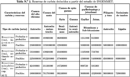 De lo antes expuesto, se deduce que los mineros informales no cuentan con ningún tipo de estudio, menos de reservas. Por consiguiente, para los propósitos del presente estudio se ha tomado en cuenta las reservas reportadas por INGEMMET en el año 1983, del que considerando una reducción del 10%, ya sea por la explotación por mineros formales e informales, y la erosión por fenómenos naturales, se tendría las reservas que presenta la tabla N.° 2. En el mismo cuadro se estima las reservas minables considerando una recuperación del 80%, lo cual correspondería al tonelaje de carbón disponible para su uso.