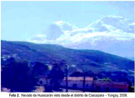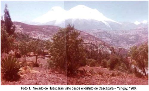 Como demostración de lo antes expuesto, las fotografías 1 y 2 muestran el nevado de Huascarán, el pico más importante de nuestro país con una altura de 6768 msnm, tomadas en 1980 y el 2008 desde del distrito de Cascapara (lugar estratégico para observar la Cordillera Blanca). En la primera vista se observa la cobertura de nevado casi total y con lenguas glaciares hasta muy abajo, mientras que en la segunda vista se observa un marcado despoblamiento del blanco nevado, con grandes depresiones negras y un gran retroceso de las lenguas glaciares. Según SENAMHI y otros, en los últimos 35 años se habrían perdido entre 22 a 26% de los glaciares y una reducción del 12% del flujo de agua.
