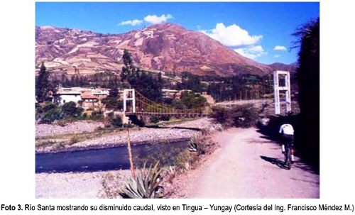 La Organización Internacional del Agua considera que en el año 2025, el Perú sería el único país de Latinoamérica que sufriría la situación traumática de quedarse sin agua en forma permanente; lo cual, parece estar más cerca de lo que se piensa, dado que ya existe manifestaciones encontradas con las comunidades por esta situación que se viene, como es el caso de la comunidad de Caraz (Huaylas), quienes han pedido que se declare en emergencia la laguna de Parón (principal reserva de agua del Callejón de Huaylas), considerando el peligro de quedarse sin agua, por el desmedido uso de ella por la central hidroeléctrica del Cañón del Pato. Tal preocupación ha impulsado a dicha comunidad, tomar el control de su desaforo desde el mes de julio del año en curso; puesto que la reserva de agua de dicha laguna ya se habría reducido en 50%; dicho proceso de reducción, irá afectando también a las grandes agroindustrias del norte, caso de Chao, Virú y Moche que son irrigados por el río más importante de la costa, el río Santa. La foto 3 ilustra al río Santa visto en la localidad de Tingua – Yungay, con un caudal muy por debajo de lo que tenía en el pasado.