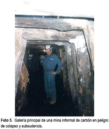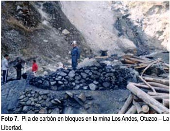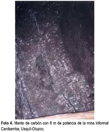 De las 20 minas estudiadas, muchas de ellas no cuentan con un estudio de reservas, por la informalidad que impera en su explotación, La foto 4 muestra un manto de carbón de 6 m de potencial explotado minero informal y la foto 5 presenta la galería principal de una mina informal con los cuadros rendidos a punto de producirse un colapso. De cada mina estudiada se tomó muestras, para su análisis en los laboratorios de Cementos Pacasmayo SAA (CPSAA) u otros a fin de determinar su calidad. Los resultados de los análisis llevados a cabo por CPSAA, se presentan en la tabla N.° 1, donde se observa que el carbón fijo para las antracitas es en promedio 83,15%.
