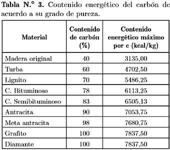 El contenido energético del carbón varía de acuerdo a su grado de metamorfismo, los valores que ilustra la tabla N.° 3, se ha deducido considerando únicamente el contenido de carbón y no otras sustancias que también contribuyen en su poder calorífico como algunos volátiles. Se observa que el máximo calor que puede desprender sería el grafito o el diamante, es decir, 7837,50 kcal/kg, y el mínimo, correspondería a la madera con 3135 kcal/kg.
