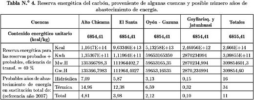 Para estimar la reserva energética, se ha tomado en cuenta el proceso de producción de la energía a partir del carbón, que incluye: a) generación de energía térmica, b) conversión de energía térmica en mecánica y c) conversión de energía mecánica en eléctrica (evaluación del uso de carbón como combustible en la central termoeléctrica “Comandante Luis Piedrabuena”, Laurence Braulio R. y otro). Considerando las eficiencias de cada proceso, se ha tomado una eficiencia global de 40%, es decir, la eficiencia de transformación de la energía del carbón en energía eléctrica, con lo que se ha estimado los KWH, MW.h y GW.h como reserva energética para las cuencas indicadas en la tabla N.° 4 y únicamente considerando las reservas de carbón probadas + probables.