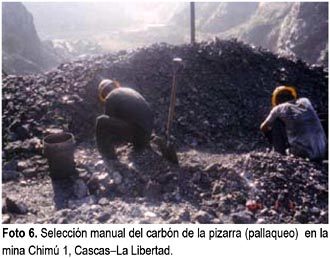 Tomando en cuenta los resultados de los análisis para el carbón antracítico de las distintas minas estudiadas, que tienen en promedio de 6854,41 kcal/kg, se tendría una reserva energética que ilustra la tabla N° 4 sin tomar en cuenta las reservas de otras cuencas y el potencial de reservas posibles. Cabe destacar que la pizarra actúa como depresor del poder calorífico del carbón, por lo que es preciso seleccionarlo como muestra la foto 6 donde se aprecia al personal de la mina Chimú 1 en pleno proceso de pallaqueo de la pizarra. Así mismo, el carbón fino (cisco), tiene menor poder energético que el carbón tipo banco (fragmentos grandes) como muestra la foto 7, que corresponde a la pila de carbón en bloques en la mina Los Andes.