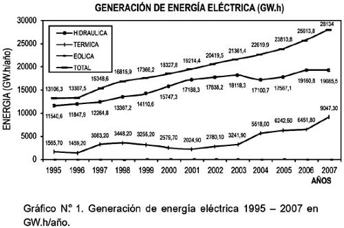 Las fuentes de generación de energía son diversas, como la hidráulica, térmica, eólica, solar, nuclear, etc. En nuestro país, las principales fuentes son las 2 primeras, y dentro de ellos la más importante es la hidráulica, como muestra el gráfico N° 1, la generación por la demanda creciente, sólo en los 3 últimos años 2005, 2006 y 2007, se ha venido incrementando en 5,3%, 7,6% y 9,8%, respectivamente (Estadística Eléctrica 2007, Ministerio de Energía y Minas). Así mismo, durante el año 2007 la generación hidráulica descendió en 0,75% por ser suplido por la generación térmica con gas de Camisea, que también ya quedó limitado por la capacidad de la tubería instalada.