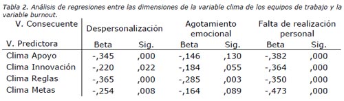 Las influencias del clima sobre el burnout afectan a las siguentes relaciones: Clima de apoyo sobre despersonalización (beta:-345, Sig: 0,01) y sobre falta de realización personal (beta:-382, Sig: 0,01); clima de innovación sobre despersonalización (beta:-220, Sig: 0,01) y sobre falta de realización personal (beta:-364, Sig: 0,01); clima de reglas sobre despersonalización (beta:-365, Sig: 0,01), sobre agotamiento emocional (beta:-285, Sig: 0,01) y sobre falta de realización personal (beta:-350, Sig: 0,01); y clima de metas sobe despersonalización (beta:-254, Sig: 0,01) y sobre falta de realización personal (beta:-473, Sig: 0,01). Estos datos nos dan pie para afirmar que el clima de los equipos de trabajo juega un papel muy relevante a la hora de prevenir la aparición del estrés de rol y el burnout.