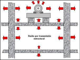 Con relación a esto último, tenemos el caso de un importante hotel cinco estrellas, donde resaltan las consecuencias de no valorar en su justa magnitud el diseño de un proyecto acústico certero; al colocarse, justo encima de un ala habitacional, parte del sistema de bombeo y 32 compresores alternativos (de los más ruidosos) distribuidos en cuatro enfriadoras. La solución no resulta una novedad ni, mucho menos, un disparate de proyecto. Sin embargo, se convierte en tal, al no haberse considerado las respectivas y correspondientes soluciones de aislamiento. El resultado se manifiesta nítidamente a través de una severa propagación de ruido aéreo y estructural, generados continuamente por las máquinas, según se ilustra en la figura.