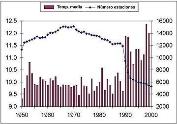 A medida de que la cantidad de estaciones (a menudo rurales) fue disminuyendo, la temperatura se ha incrementado en una proporción inversa, sugiriendo que el Efecto de Isla de Calor Urbano es el componente clave de cualquier aumento