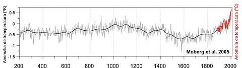 Este gráfico se ve sombrío hasta que es puesto en el contexto de la temperatura media para 1901-2000 es 13,9ºC, de manera que estamos hablando de un cambio de 13,5 a 14,3ºC, o un aumento de apenas 0,8ºC. Científicamente, deberíamos usar temperaturas absolutas (o Kelvin) que añadirían 273ºC adicionales. En este contexto el aumento es de 0,3º%. Nótese que en el gráfico que este conjunto primario de datos pone al calentamiento global observado en 0,42ºC por encima de la media. Como se aprecia en el gráfico, este aumento desde mediados de 1880 es similar al del ocurrido desde el año 1000 de nuestra era, aunque el IPCC dice que la actual temperatura probablemente sea más alta. Las muestras de hielo de Groenlandia indican que el comienzo de la información instrumental (termómetros) coincide con un período frío en el hemisferio norte, y que en el lugar de un bien estudiado cilindro de hielo, la temperatura a mediados del siglo 19 fue la más fría en los últimos 8.000 años.