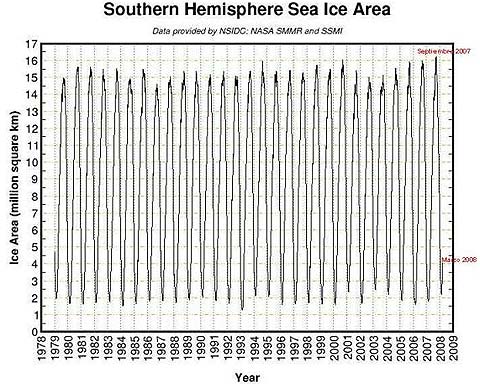 • El Ártico alcanza en 2007 baja cobertura de hielo record: Los medios pregonaban esto casi todos los días durante el verano del hemisferio norte de 2007. Un poco más abajo en casi todas las páginas web de las instituciones más importantes que monitorean al hielo en el mundo había información adicional. La cobertura de hielo de la Antártida al mismo tiempo era superior a los niveles de extensión jamás alcanzados y registrados. Por ejemplo, ver el Programa Criosfera de la Universidad de Illinois. En cada caso, las mediciones confiables comienzan sólo desde el arribo de la era de los satélites meteorológicos en 1979., otro dato constantemente omitido. Sin embargo, desde que el Pasaje del Noroeste se abrió a la navegación en 1903-1905 (por Gjøa/Roald Amundsen), y otra vez en 1940-42, y nuevamente en 1944 (St. Roch), es posible que esta reciente reducción en el hielo del Ártico no sea una indicación de calentamiento. Además, Science, (27 Septiembre 2007) informa que la pérdida del hielo de la Antártida gatilló el último calentamiento y la eventual emergencia de la última edad de hielo, trayendo a la superficie la pregunta de si la actual expansión del hielo Antártico es suficiente para gatillar la próxima edad de hielo?