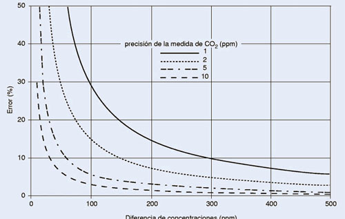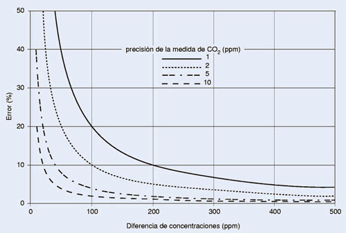 Co = concentración exterior de dióxido de carbono (ppm) Ct = concentración final de dióxido de carbono (ppm) Ci = concentración inicial de dióxido de carbono (ppm) t = tiempo (h) A partir del Nº de renovaciones se calculará el caudal de ventilación (QExterior) QExterior (m3/h) = Volumen del recinto (m3) x Nº renovaciones (h-1) Para la correcta utilización de todos estos métodos es necesario tener muy en cuenta, no sólo sus limitaciones y condiciones óptimas de aplicación sino también, y en especial, la precisión de lectura del instrumento disponible ya que al depender el resultado de la diferencia de concentraciones de dióxido de carbono si ésta es poca un pequeño error en la medida se transformará en un error mucho mayor en el valor del caudal. En las figuras 1 y 2 se indica este efecto. Figura 1. Error en la determinación del caudal de aire exterior