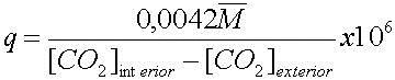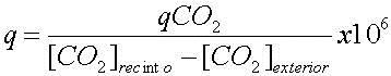 siendo: qCO2 = la tasa de generación de dióxido de carbono en I/s por persona y M = la actividad metabólica expresada en met En un estado estacionario del sistema de ventilación, la relación entre el caudal de aire exterior, las concentraciones de dióxido de carbono y la tasa de generación de dióxido de carbono puede deducirse de un balance de masas de dióxido de carbono y resulta ser: