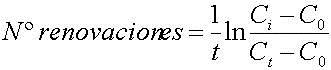 Siendo M la actividad metabólica media de los ocupantes Para aplicar correctamente esta ecuación hay que tener en cuenta las limitaciones de uso debidas a las hipótesis de trabajo mencionadas. Los valores de concentración deben medirse simultáneamente y la actividad metabólica media de los ocupantes puede estimarse con métodos relativamente sencillos como los propuestos en la norma UNE EN 28996-95 (Ergonomia. Determinación de la producción de calor metabólico) (ver NTP-323). Utilizar la concentración de dióxido de carbono como indicador de ventilación sólo es válido en aquellos espacios en que hay suficientes ocupantes para servir de fuente de dióxido de carbono y que, además, han permanecido en el mismo el tiempo necesario para que el nivel de dióxido de carbono alcance el equilibrio. Además otra limitación del método está asociada a la necesidad de estimar la producción de dióxido de carbono por las personas basada en su actividad física que puede ser una fuente importante de error compensable en parte si el número de ocupantes del local es elevado. Método de la caída de la concentraciónConsiste en medir, en el local sin ocupantes, la disminución de la concentración de dióxido de carbono a lo largo de un periodo de tiempo. El cálculo del caudal de ventilación se realiza a partir del n°- de renovaciones de aire del local aplicando la expresión: