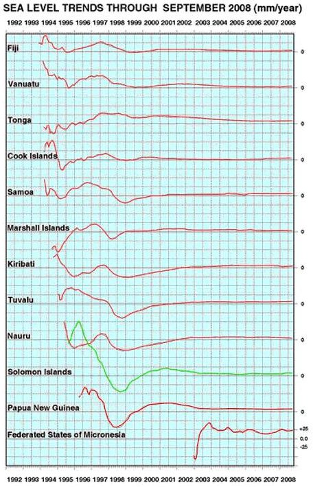 Sobre todo cuando vemos que el nivel del mar en otras regiones pobladas de islas, también amenazadas con ser tragadas por el mar, como el cercano Océano Pacífico occidental, con Tuvalu, Kiribati, Salomon, etc, los niveles de mar se mantienen en un ascenso que, más que raquítico, puede ser clasificado como nulo. Si la oficina de medición de mareas de Australia no le está errando, por lo menos le pega en el poste: