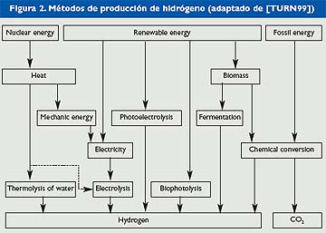 Afortunadamente, tanto los procesos como las fuentes para producir hidrógeno son muy variados. En la Figura 1 se muestran éstas vistas desde el lado de la producción y de las aplicaciones, y en la 2 los principales métodos para la producción de hidrógeno, que serán comentados seguidamente.
