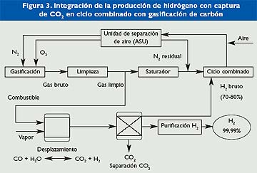 La gasificación es un proceso de combustión con defecto de aire (10 a 50% del estequiométrico). El gas producto contiene CO, CO2, H2 y CH4. El proceso se verifica entre 700 y 1.500ºC y es aplicable también a biomasa y carbón. Precisamente la gasificación de carbón con captura de CO2 es una de las técnicas que despiertan mayor interés, tanto en la Unión Europea como en Estados Unidos, debido a que el recurso se halla muy repartido y a que cuando se integra esta técnica en ciclo combinado (GICC) se pueden producir de manera simultánea hidrógeno y electricidad, derivando la producción hacia el vector energético que más interese. En la Figura 3 se aprecia el esquema de esta técnica.