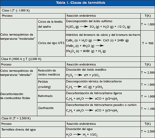 La termólisis consiste en la ruptura de la molécula del agua por acción del calor. Existen varias maneras de llevar a cabo dicha ruptura, recogiéndose un esquema de las mismas en la Tabla 1. De todas ellas, la termólisis directa del agua es inabordable debido a que se desarrolla a grandes temperaturas, siendo alcanzables el resto de procesos que se pueden implantar ya sea con energía solar concentrada o con energía nuclear. De los ciclos termoquímicos de temperaturas moderadas, el más prometedor es el SI (familia del azufre) que logra una eficiencias del 38%; en cuanto a los de temperaturas elevadas, el ciclo del Zn/ZnO es el más interesante, alcanzando un rendimiento del 45% y pudiendo verificarse a 1.300 K si se ayuda con carbono.