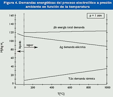 La electrólisis es quizás el procedimiento más “intuitivo” para producir hidrógeno a partir del agua. Sin embargo, resulta un procedimiento poco eficiente si se realiza a baja temperatura. Piénsese que a 83ºC se requieren como mínimo 2,83 kWh eléctricos para producir 1 m3 normal de hidrógeno, cuando la energía contenida en éste es de 3 kWh, de los que tan solo se recuperaría en forma de electricidad en torno a la mitad en el mejor de los casos en una pila de combustible. Sin embargo, si el proceso se verifica a alta temperatura, lograda mediante energía solar concentrada o energía nuclear, la recuperación energética es mejor debido a que la demanda de energía eléctrica se reduce en favor de la térmica, tal como se deduce de la Figura 4.