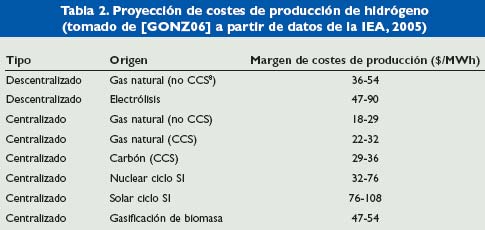energía, aunque con cierta variación de costes. La Tabla 2 recoge una estimación de los costes de producción según las fuentes y procedimientos. Se aprecia que el recurso más económico es el gas natural, seguido a corta distancia del carbón. La gasificación de la biomasa ocupa el segundo escalón, seguida de cerca por los ciclos termoquímicos activados por energía nuclear, siendo la opción más cara la activación de esos ciclos por energía solar. En cuanto al horizonte temporal de integración de dichas fuentes, queda recogido en la Figura 5.