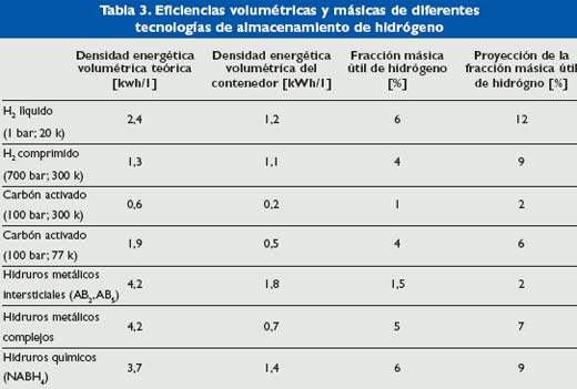 La técnica más sencilla de almacenamiento es como hidrógeno comprimido, en fase gaseosa. En la actualidad se almacena a 200 bar, llegando los equipos avanzados a 700 bar. El consumo para lograr esas presiones es elevado, aunque no tanto como en el procedimiento de licuefacción. Así, a 200 bar se consume un 10% de la energía almacenada, mientras que a 700 bar un 15%. Hoy día es común trabajar a 350 bar en aplicaciones de transporte recurriendo a balas de materiales compuestos. El hidrógeno líquido requiere temperaturas criogénicas a presión ambiente (-253ºC). A esas temperaturas la manipulación se complica, por lo que su uso está reservado hoy por hoy a fines industriales. Por otra parte, su consumo energético es muy elevado: el 30% de la energía contenida en el hidrógeno almacenado, aunque, como ilustra la Tabla 3 es el procedimiento que produce mayores densidades.