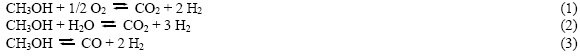 El hidrógeno puede obtenerse por tres vías catalíticas diferentes a partir del metanol: (i) oxidación parcial con oxígeno o aire (Ec. 1); (ii), reformado con vapor de agua (Ec. 2); y (iii), descomposición (Ec. 3):